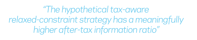 of the hypothetical strategies we considered in the paper. It shows that after taxes, both LO and RC hypothetical strategies implemented as tax-aware outperform their tax-agnostic counterparts. While not shown here, in the paper, we show that there is some pre-tax information ratio degradation due to tax awareness. However, as Figure 1 demonstrates, it is more than compensated by greater tax efficiency. Moreover, the hypothetical tax-aware RC strategy has a meaningfully higher after-tax information ratio than all the other strategies.