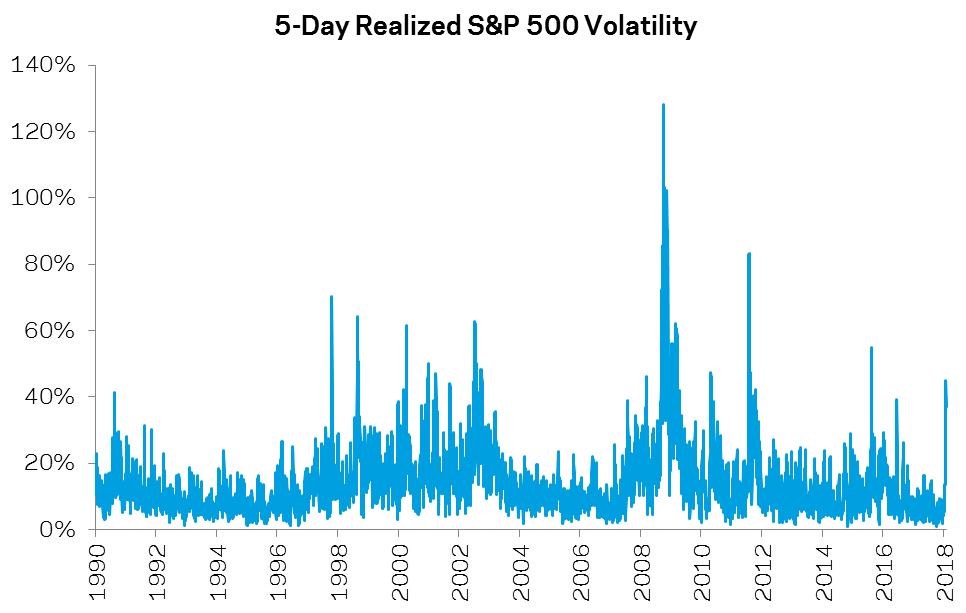 That’s big. But we’ve seen much bigger. The maximum occurred, not surprisingly, in the teeth of the Global Financial Crisis (10/09/2008 – 10/15/2008), hitting 128.2% annualized over those five days (and a nice example of the silliness of annualizing 5-day events!). The 99th percentile 5-day rolling volatility from 1990-present is 55.5%, and the recent 5-day period of 38.9% registers a 97th percentile. Sure, those are big outcomes, but two standard deviation events are a dime a dozen in financial markets. To put it into perspective, below I graph this realized 5-day volatility back to 1990.