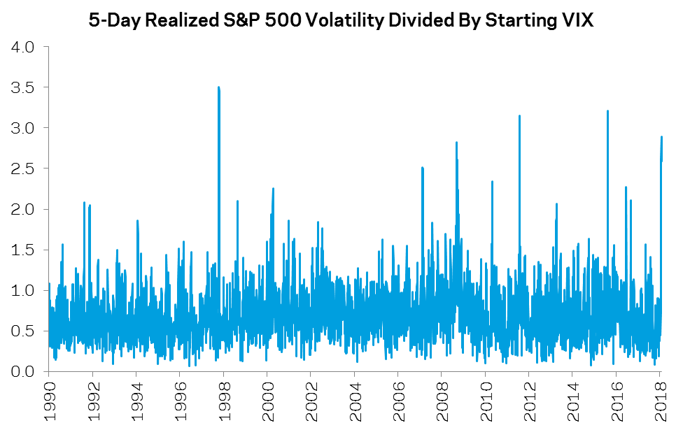 The maximum ratio ever hit was 3.5x (over the period 10/22/1997 – 10/28/1997), when U.S. stock markets declined during the 1997 Asian financial crisis. This 1997 maximum surprise came about in a somewhat different way than recent events. Unlike last week, the VIX didn’t start this 1997 stretch low and then get hit with big vol. Rather, it began on 10/21/1997 with a VIX of 19.5%, which is the 60th percentile (last week’s drawdown began from a VIX of 13.5% which is the 24th percentile
