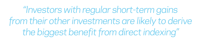 Second, as time progresses, after approximately five to six years, the presence of regular short-term gains can make a difference between a positive tax benefit and a small tax liability. 3 3 Close A direct indexing strategy builds up unrealized gains due to the deferral of gains in earlier years. While this is generally beneficial for an investor, a consequence is that after a few years, rebalancing the strategy (e.g., to stay within a certain tracking error of the index) may cause the strategy to realize more gains than losses and result in a tax liability rather than a tax benefit. While many investors familiar with direct indexing strategies expect their tax benefits to decay over time and to be generally lower in the absence of short-term gains from other investments, Figure 1 shows just how striking the impact is.