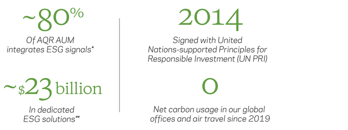 Across the firm, E, S, and/or G-related signals are actively integrated in the majority of our portfolios. We also offer dedicated ESG solutions. These include Sustainable strategies that incorporate negative screens and positive tilts, portfolios customized with our clients to address specific ESG priorities, and portfolios targeting substantial carbon reduction.
